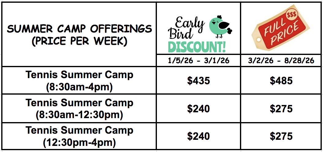 Join us for an exciting summer at our Tennis Camp with high-energy and team-oriented training designed to elevate your game! This camp combines skill-building drills, exciting team challenges, and competitive play to help players develop both individually and as part of a team. Each day features targeted strokes to improve technique as well as friendly competitions!